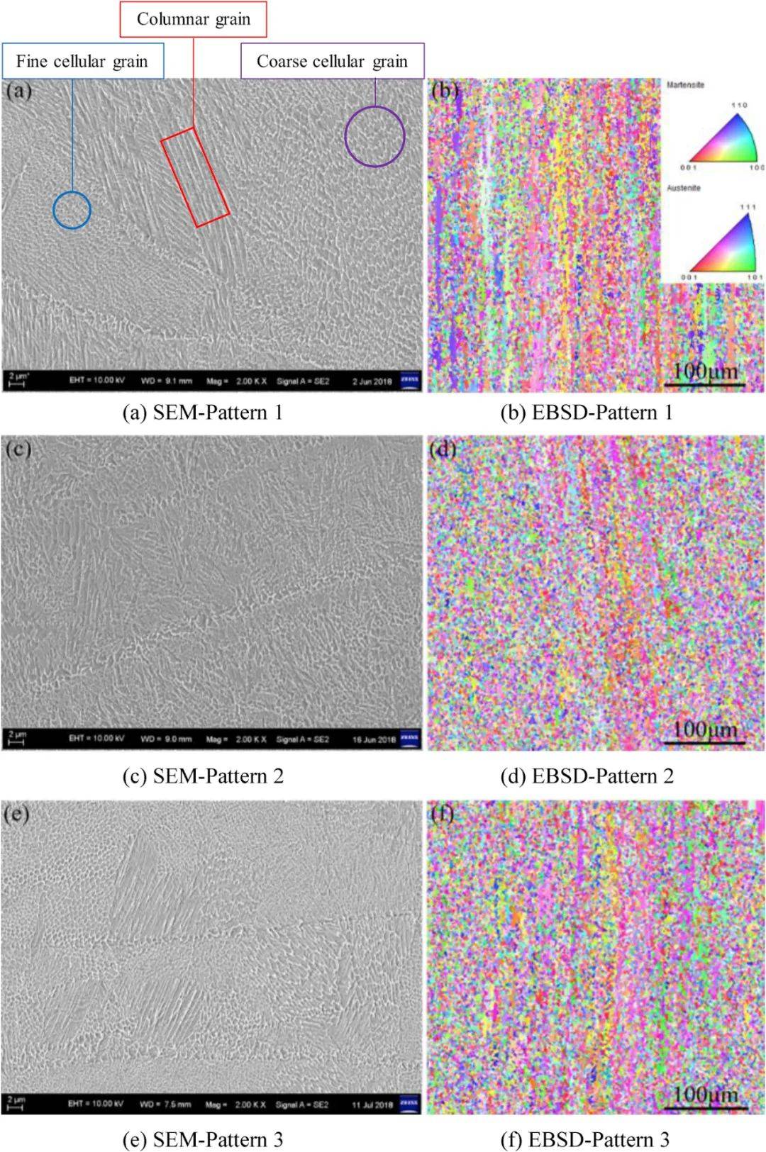 在圖 10用XRD分析了拉伸前后試樣的拉伸變形行為。 EBSD也是如此。圖 7(b)同時觀察到馬氏體和殘余奧氏體。拉伸試驗后馬氏體的體積分數(shù)保持相似,殘余奧氏體從7.8%變?yōu)?.6%。這種微觀結(jié)構(gòu)的變化是由低延伸率(0.3-1.55)的早期斷裂引起的。拉伸試驗后的EBSD試樣如圖所示圖 13。在反極圖中(IPF)地圖和極圖(PF),?001?紋理見圖 13。凝固最重要的因素包括溫度溫度梯度(G)和生長率(R)。高G/R比導致柱狀微觀結(jié)構(gòu),低G/R比導致柱狀晶狀或等軸晶狀結(jié)構(gòu)。