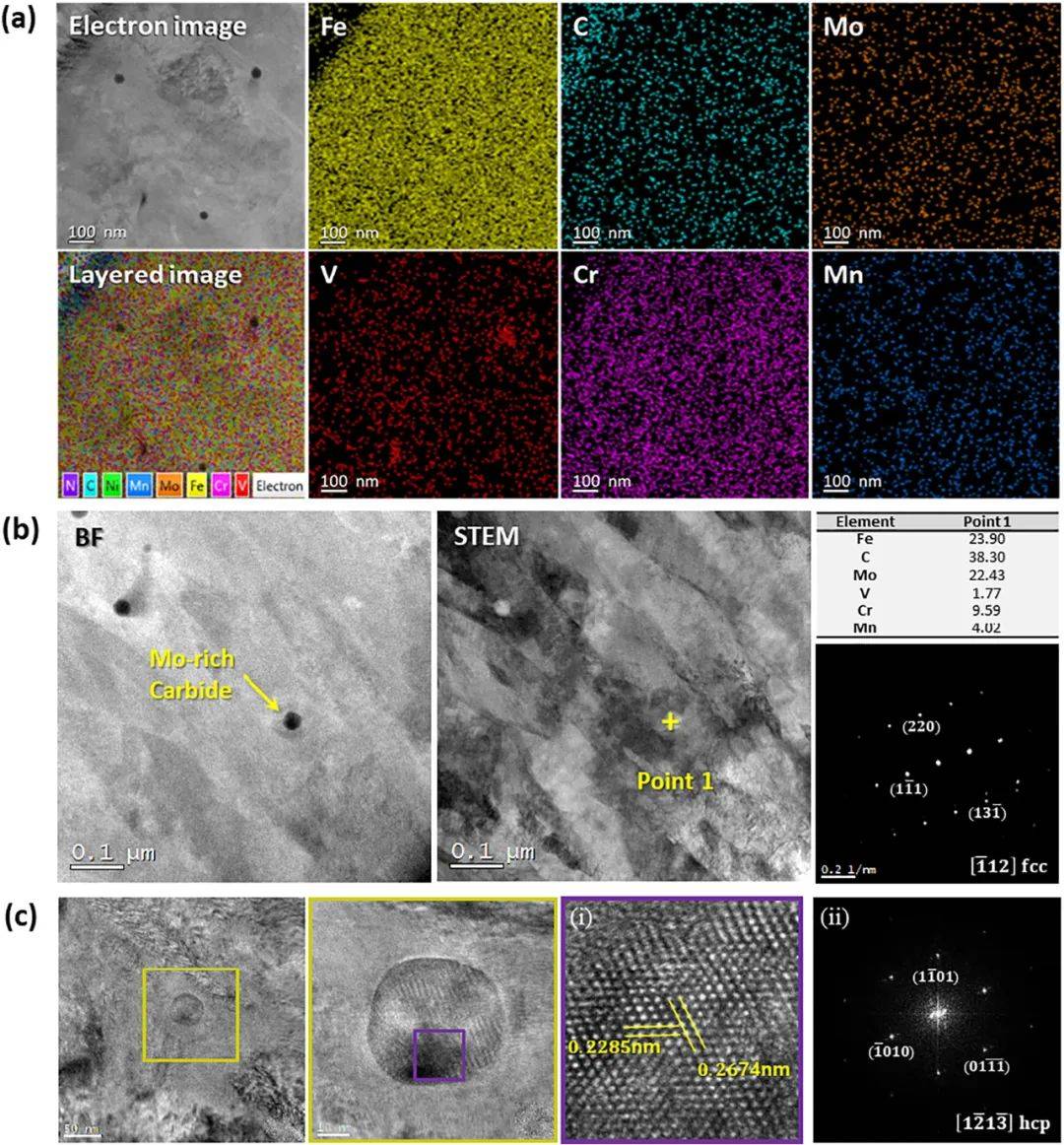進行TEM分析以識別H13鋼中的碳化物。圖 11(a)顯示了S2樣品中富釩碳化物的TEM EDS圖譜結(jié)果。 圖 11(b)顯示明場和HAADF(高角度環(huán)形暗場)-STEM(掃描透射電子顯微鏡)圖像。富鉬碳化物的球形類型通過具有[112]區(qū)軸的奧氏體基體中的EDS分析得到證實。眾所周知,H13工具鋼具有各種碳化物,例如具有顯示球形的fcc晶體結(jié)構(gòu)的MC(富含V ),具有顯示橢圓形的hcp結(jié)構(gòu)的M2C(富含Mo ),具有顯示棒狀的fcc晶體結(jié)構(gòu)的M6C(富含Mo和Fe ),具有顯示大球形顆粒的hcp結(jié)構(gòu)的M7C3(富含Cr ),以及具有顯示不規(guī)則球形或方形顆粒的fcc結(jié)構(gòu)的M23C6(富含Cr、Fe和Mo.在圖11,M2C也通過高分辨率TEM (HRTEM)分析和沿著hcp晶體結(jié)構(gòu)中的帶軸獲得的相應FFT(快速傅立葉變換)斑點圖案證實。