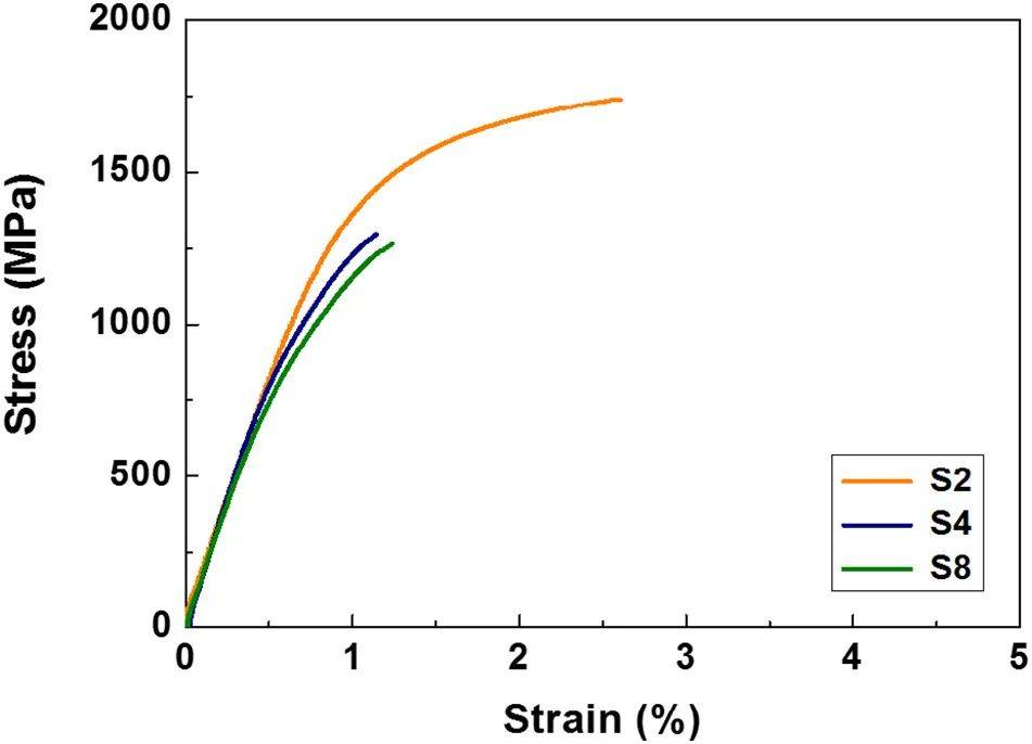 X-Y、Y-Z和Z-X的維氏硬度結(jié)果總結(jié)在圖 8中。 對于所有X- Y、Y-Z和Z-X,S2的硬度最高,接近585 HV。S4和S8的硬度分別為520 HV和470 HV。由于高孔隙率下的部分斷裂,硬度隨著掃描速度降低。如所示圖 8較高的掃描速度產(chǎn)生較高的孔隙率,從而導致較低的硬度。每個樣品的應力-應變曲線總結(jié)于圖 9,具有屈服強度、抗拉強度和伸長率。屈服強度隨掃描速度的增加而降低,S2的屈服強度最高,為1340 MPa。在S2 (1704 MPa)、S4 (1327 MPa)和S8 (1227 MPa)的拉伸強度中,可以更明顯地觀察到這種由掃描速度引起的機械性能的降低。最大的伸長率也出現(xiàn)在S2 (1.6%)。