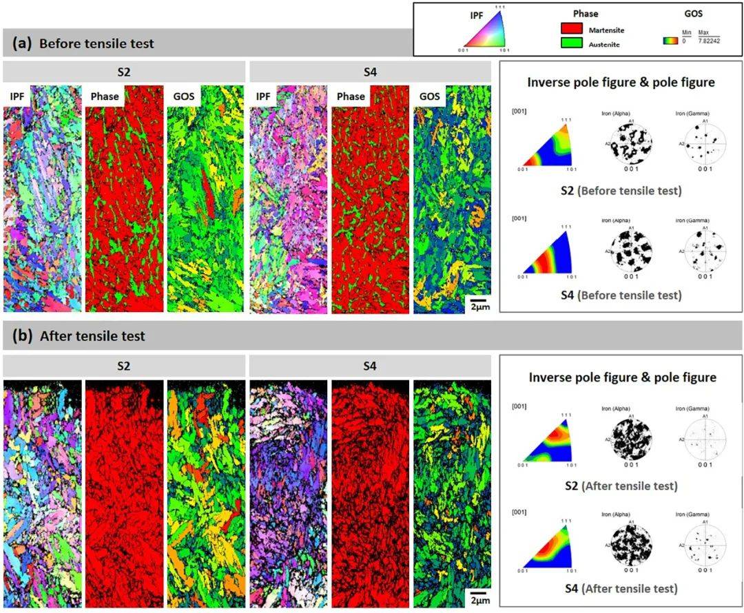 圖13.S2和S4樣品(a)在Y-Z平面拉伸試驗之前和(b)之后的EBSD反極圖(IPF)、相位和晶粒取向分布圖(GOS)。