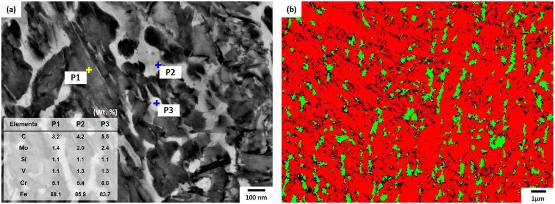 在馬氏體相變過程中,C原子可能不會擴散,而是作為間隙原子存在,因此C含量是相似的。 殘余奧氏體可以在室溫下存在,由于快速冷卻速率引起的殘余熱應力,奧氏體穩(wěn)定。此外,鉬增加了碳的激活能,從而延緩了碳的擴散并且形成具有殘余奧氏體形成的富碳區(qū)域。