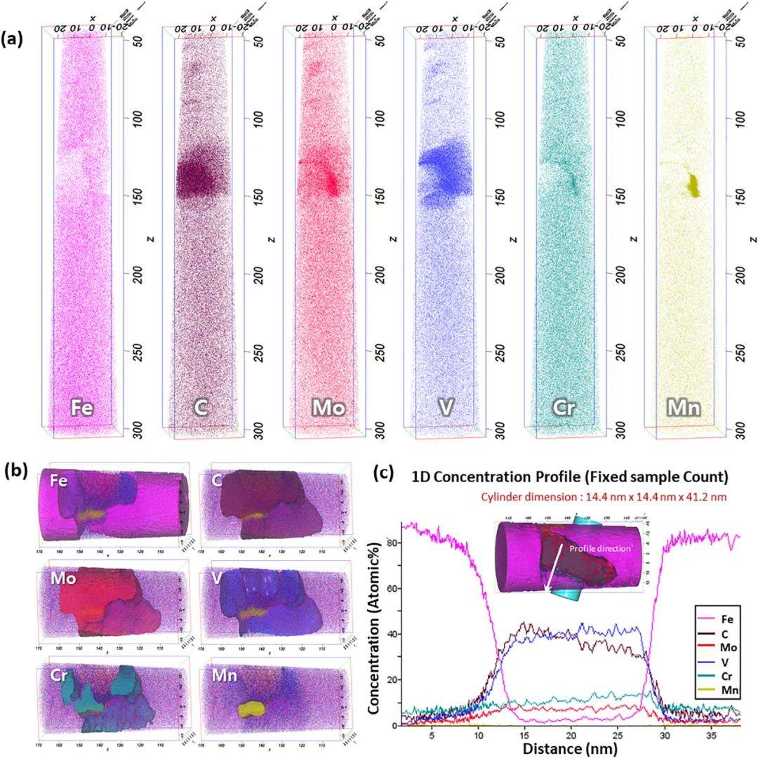 圖12.(a) 3D APT尖端重構(gòu),和(b)Fe、C、V、Cr、Mn和Mo原子位置的等值面性質(zhì)。(c)沿圓柱體的1D成分剖面。