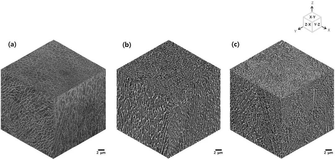 S2、S4和S8的X-Y、Y-Z和Z-X的SEM圖像示于圖 6。 如Y-Z和Z-X平面所示,通過定向凝固形成柱狀晶粒。柱狀晶粒傾向于沿Z方向生長,因為它在凝固過程中遵循來自固體部分的優(yōu)選取向25在X-Y平面上,可以觀察到柱狀晶晶粒的截面,對S2來說是2微米,1微米和0.5微米,分別是S4和S8。這種依賴于掃描速度的定向生長行為是由高激光掃描速度條件下的快速散熱引起的,并且柱狀晶粒在生長期間必須在成核點區(qū)域競爭。在這里圖7,化學成分分析結(jié)果顯示為內(nèi)部柱狀晶粒和晶界。雖然化學成分沒有顯著差異,但柱狀晶中白色部分的C含量為4-5 %, Mo含量約為2%,比灰色部分高1%。如所示圖 7(b)柱狀晶內(nèi)有馬氏體和殘余奧氏體,比例為4:1。