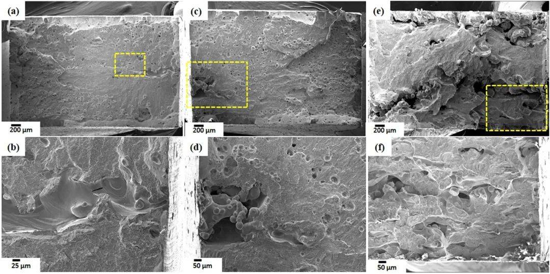 圖14.(a)(b) S2、(c)(d) S4和(e)(f) S8試樣的SEM斷口圖,以及拉伸試驗后整個區(qū)域選定區(qū)域的放大圖。