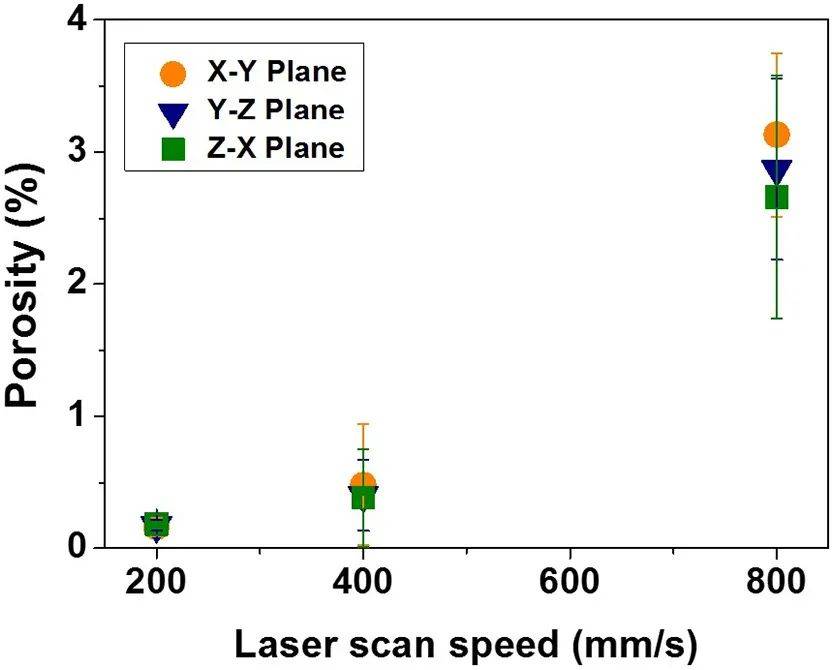 圖3.SLM加工H13鋼試樣的孔隙率與激光掃描速度的關系。