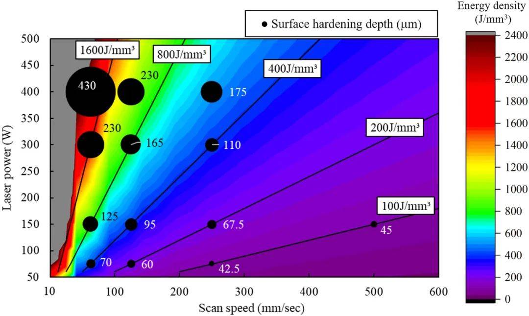 圖17 硬度深度隨著激光功率、掃描速度以及相應的激光能量密度變化時的結(jié)果