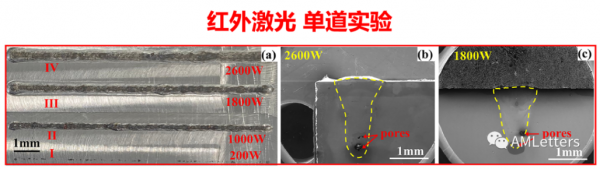 (3)當紅外激光功率進一步增加到1800瓦以上時,單道會出現(xiàn)直徑為200微米的明顯孔洞。