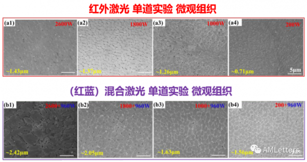 (1)隨著純紅外激光功率從200瓦增加到2600瓦,一次枝晶臂間距(PDAS)從0.71微米增加到1.43微米。