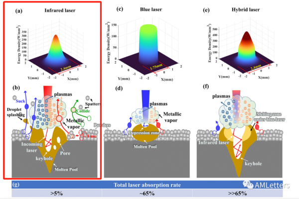 (2)高反金屬對紅外激光的吸收率低,所以加工時需要較高的功率,但高功率的激光會導致熔池穩(wěn)定性較差。藍光激光的波長較短,高反金屬對其的吸收率高,但藍色激光器的功率較低,導致零件的致密度較差。通過將高功率紅外激光和低功率藍色激光復合,可以有效解決以上兩個問題。