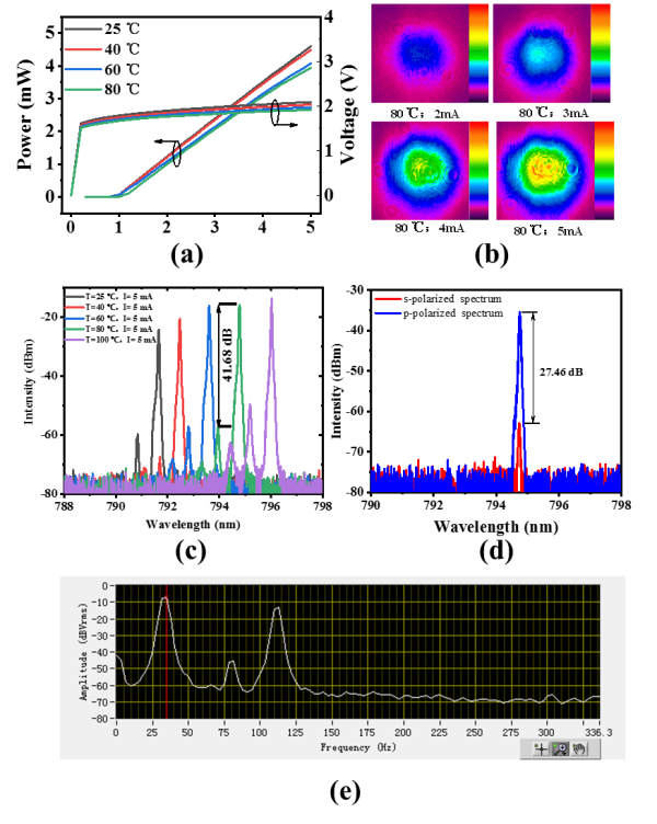 圖(a)VCSEL在不同溫度下的P-I-V特性曲線,內(nèi)插圖為芯片實物圖;(b)80℃不同電流下VCSEL的近場光斑;(c)VCSEL的光譜特性;(d)VCSEL的偏振特性;(e)采用VCSEL作為泵源的量子陀螺儀信噪比測試結(jié)果