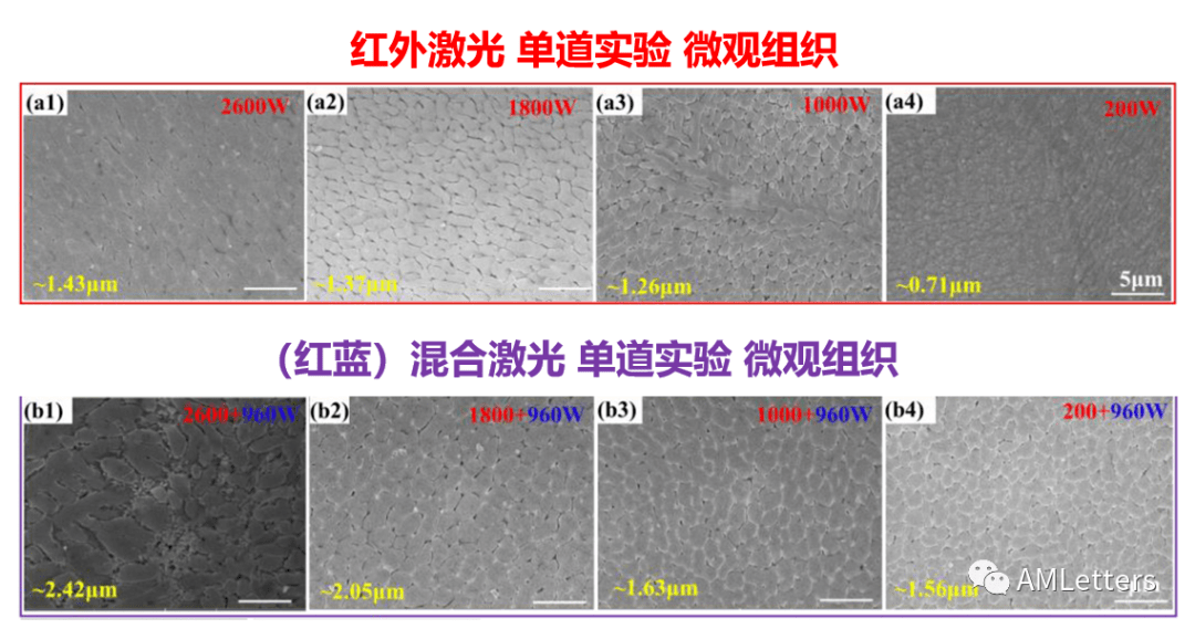 (1)隨著純紅外激光功率從200瓦增加到2600瓦,一次枝晶臂間距(PDAS)從0.71微米增加到1.43微米。