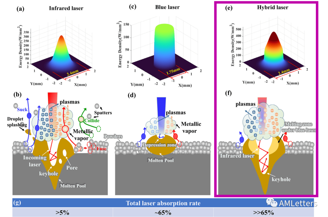 (2)高反金屬對紅外激光的吸收率低,所以加工時(shí)需要較高的功率,但高功率的激光會導(dǎo)致熔池穩(wěn)定性較差。藍(lán)光激光的波長較短,高反金屬對其的吸收率高,但藍(lán)色激光器的功率較低,導(dǎo)致零件的致密度較差。通過將高功率紅外激光和低功率藍(lán)色激光復(fù)合,可以有效解決以上兩個(gè)問題。