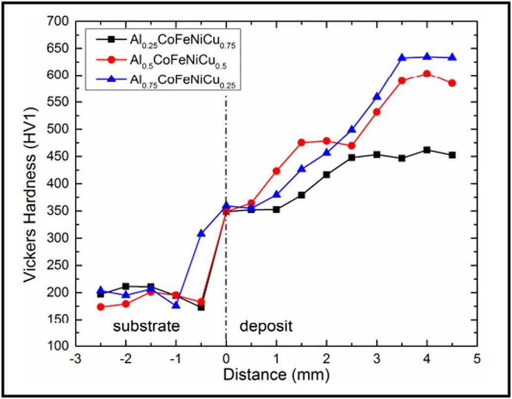 圖24 以cofenialxcu1 -x為基礎(chǔ)的(0.25≤x≤0.75)LC-HEACs的維氏硬度分布曲線顯示硬度向基體方向遞減。此外,由于固溶強(qiáng)化效果,Al0.75Cu0.25、Al0.5Cu0.5和Al0.25Cu0.75涂層的最大硬度分別為426.3HV、519.4HV和541.1HV。