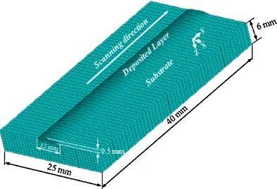 LC技術(shù)是一個復(fù)雜的過程,通過實(shí)驗(yàn)研究無法理解激光與材料的相互作用、粉末流動、熔池和傳熱模式。因此,使用基于數(shù)值的模型來解決復(fù)雜的數(shù)學(xué)模型。這些模型的結(jié)果通常是精確的,可以用于實(shí)現(xiàn)高質(zhì)量的CLAD。數(shù)值模型通常分為三個部分:熔池、熔覆特征和粉末流動動力學(xué)。為了改善包層特性,Anas等人開發(fā)了一個數(shù)值模型,使用COMSOL Multiphysics優(yōu)化包層特性,并將其與實(shí)驗(yàn)結(jié)果進(jìn)行了比較。結(jié)果表明,長寬比誤差為13.95%,包層角誤差為6.10%,稀釋率誤差為1.72%。LC-HEAC的熱動力學(xué)和熱機(jī)械行為與普通覆層不同,并通過數(shù)值模擬進(jìn)行了研究。