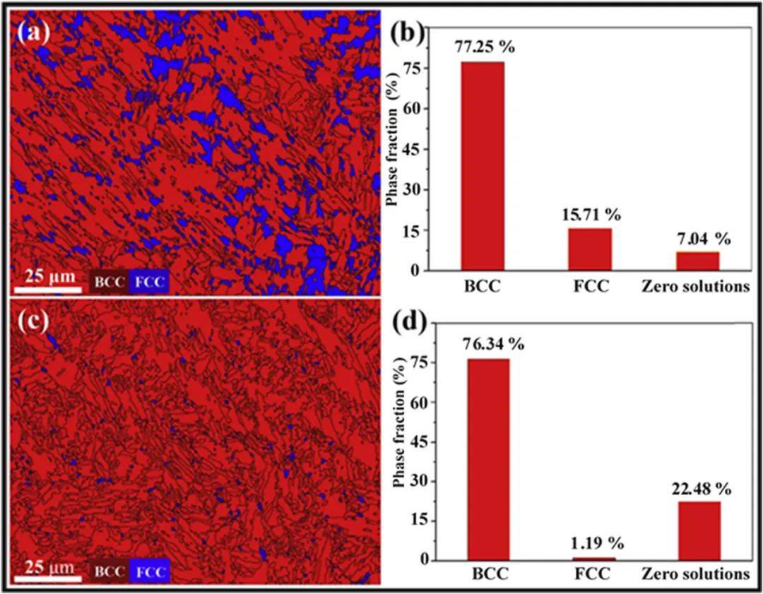 圖 22圖中包含EBSD圖,其中紅色表示BCC相位的外觀,藍(lán)色表示FCC相位分布,以及CrCoNiFeAl-xNbC(LC-HEAC)相位的條形圖,描繪了FCC和BCC相位的百分比外觀。陶瓷顆粒的加入抑制了FCC晶格結(jié)構(gòu);(a & b) x = 0 wt%;(c & d) x = 20 wt%。