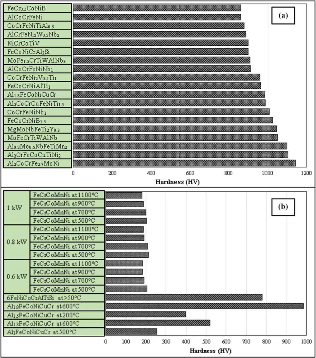 固溶體強(qiáng)化:固溶體對含有四種以上不同結(jié)構(gòu)元素的HEAs的影響是重要的。這些HEAs合金元素導(dǎo)致晶格畸變,影響固溶相結(jié)構(gòu)和機(jī)械性能,尤其是硬度。如上一節(jié)所示,LC-HEACs的淬火速率高,熔覆層致密,成分分布均勻,組織細(xì)化。結(jié)果表明,相同成分的lc -HEAC的硬度優(yōu)于其他HEAC技術(shù)。不同研究文章的硬度數(shù)據(jù)(見圖23)顯示,LC-HEACs的顯微硬度大多是通過固溶強(qiáng)化而提高的。關(guān)于LC-HEACs的強(qiáng)化機(jī)制有很多報(bào)道,研究者研究了某些合金元素的加入對通過LC技術(shù)合成的非等摩爾HEACs的影響。