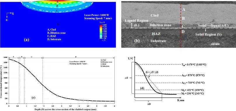 圖B (a)覆蓋片的橫斷面上的等溫線模型(b)覆蓋片的顯微圖(300×),包括覆蓋層、稀釋區(qū)、熱影響區(qū)和襯底(c)截面溫度分布,(d)溫度梯度示意圖(G)計(jì)算。