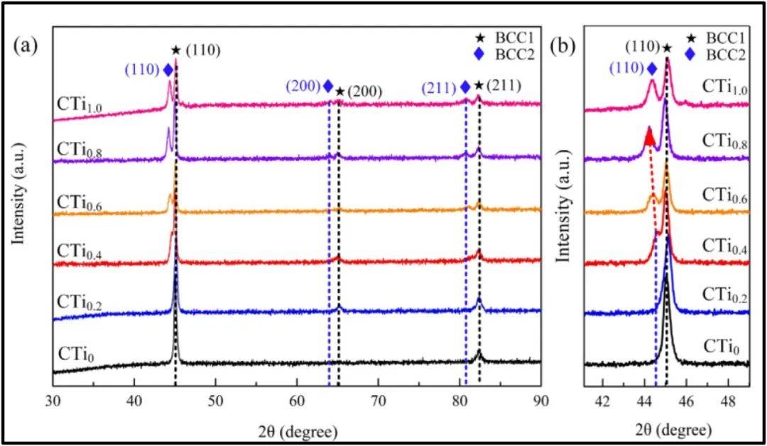 圖25 tic增強(qiáng)alfenicocrtix基LC-HEACs的XRD分析表明,Ti含量的加入導(dǎo)致了BCC2相的形成,并導(dǎo)致了固溶強(qiáng)化的形成。這種硬化模式在x=1中占主導(dǎo)地位。
