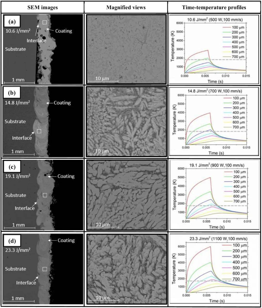 在另一項(xiàng)研究中,Ley等人還利用界面區(qū)的熱動力學(xué)模型,借助COMSOL上的有限元模擬,研究了不同激光注量下激光熔覆CrMoTaWZr微觀結(jié)構(gòu)的發(fā)展?軟件建立了LC-heac的微觀結(jié)構(gòu)與通過不同深度傳熱模型獲得的時(shí)間-溫度循環(huán)之間的關(guān)系。時(shí)間-溫度曲線(參考圖18)顯示,由于混合不均勻,且估計(jì)峰值溫度(熱模型預(yù)測)低于基體熔點(diǎn),低激光注量產(chǎn)生的涂層冶金結(jié)合不良。