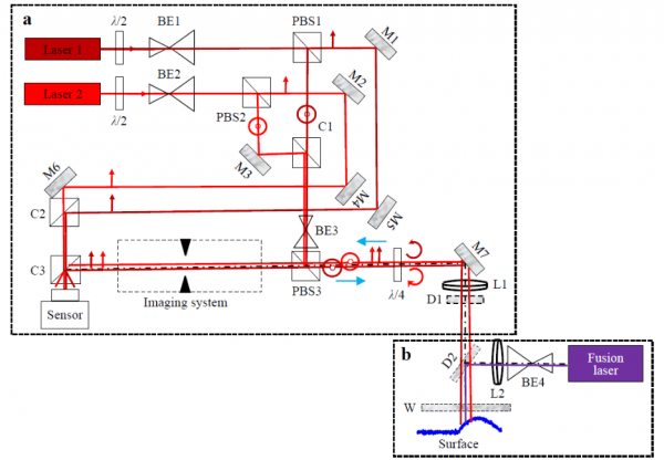 傳統(tǒng)單頻數(shù)字全息干涉利用兩束同頻光的干涉(一束經(jīng)過物體,一束參考),然后解析其相位并反演物體尺寸信息。因?yàn)槠錅?zhǔn)確測量范圍局限在 0~2 π。其物體尺寸測量范圍也局限在光源波長級別。雙頻數(shù)字全息干涉利用兩個有微小波長差異的激光進(jìn)行干涉產(chǎn)生拍頻,其干涉信號中含有等效合成波長的相位信息,等效合成波長可表示為:因?yàn)閮蓚€波長差異很小,其等效合成波長數(shù)值很大,因此其對應(yīng)的 0~2 π 相位信息的物體尺寸檢測范圍可極大提高。文中測量原理如圖1所示:兩個不同波長的激光分別為:λ1=632.8nm(20mW);λ2=634.4nm(50mW)。其對應(yīng)的合成波長 λsyn=286.74 μm。兩個激光器分別通過偏振分束器(PBS1 和PBS2)分別產(chǎn)生兩路信號,一路作為參考信號,經(jīng)由 M6 和 C2 到相機(jī);另外一路作為探測光,經(jīng)由 M3 和 C1,最后照射到被測目標(biāo)(熔池)后反射,再經(jīng)由 M7,C3 到相機(jī)。參考光和探測光干涉產(chǎn)生全息信號,最后再進(jìn)行處理反演得到被測目標(biāo) 3D 形貌,其空間分辨率約 15.2 μm。目標(biāo)物安裝在XY 平臺,做激光熔融的激光波長為 1080nm,功率 50W-500W 可調(diào),激光熔融點(diǎn)大小為直徑 70-200μm。