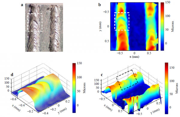 圖2:a 鋁合金熔融軌跡實(shí)際照片;b 雙波長全息術(shù)測量的鋁合金熔融軌跡;c 雙波長全息術(shù)測量的鋁合金熔融軌跡3D 形態(tài);d 局部圖(b中白色框出的區(qū)域)圖 2 對比結(jié)果表明了雙波長全息術(shù)對熔融軌跡 3D 形貌測量的可靠性。熔融軌跡中的人字形結(jié)構(gòu)清晰可見。