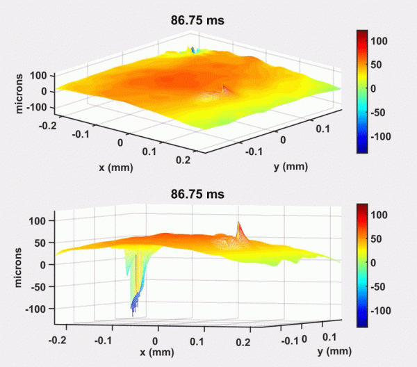 結(jié)果觀察到了明顯的熔池波動,以及熱區(qū)域軌跡的建立。這些初步結(jié)果都證明了使用雙波長全息術(shù)對熔池 3D 形貌監(jiān)測的可行性。