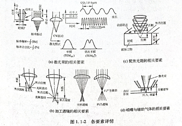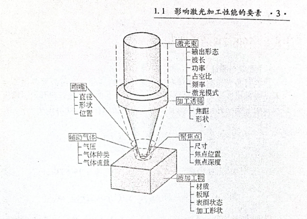圖1.1-1和圖1.1-2中顯示的是影響激光加工性能的各主要因素。加工性能的提高,離不開對(duì)這些要素的優(yōu)化。