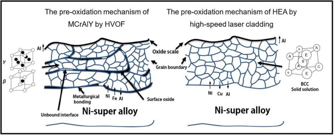 圖40 HVOF與LC-HEAC制備的傳統(tǒng)MAlCrY涂層預(yù)氧化機(jī)理差異示意圖晶格結(jié)構(gòu)給出了材料不同的擴(kuò)散系數(shù)。由于Al的持續(xù)滲透,較好的非粘結(jié)界面、表面的氧化膜以及具有較好的層狀結(jié)構(gòu)的部分界面結(jié)合提供了一種阻塞效應(yīng)。