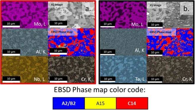 圖43 結(jié)合EDX和EBSD分析對(duì)NbMoCrAl (a.)和TaMoCrAl (b.)進(jìn)行表征。