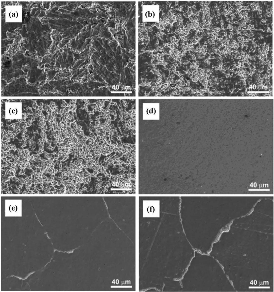 圖38 侵蝕表面形貌的SEM圖像;(a) 5小時(shí)后基材表面外觀粗糙是由于韌性斷裂造成的;(b) 10小時(shí)后,基材表面侵蝕加劇,出現(xiàn)嚴(yán)重粗糙化;(c) 15小時(shí)后因空化、裂紋、坑洞和嚴(yán)重塑性變形而湮滅的表面;(d) AlFeCoCrNi基LC-HEAC在5小時(shí)后表面光滑,變形可忽略;(e) 10小時(shí)后,LC-HEAC表面在晶界附近開(kāi)始侵蝕;(f) LC-HEAC表面在15小時(shí)后也表現(xiàn)出輕微的塑性變形。