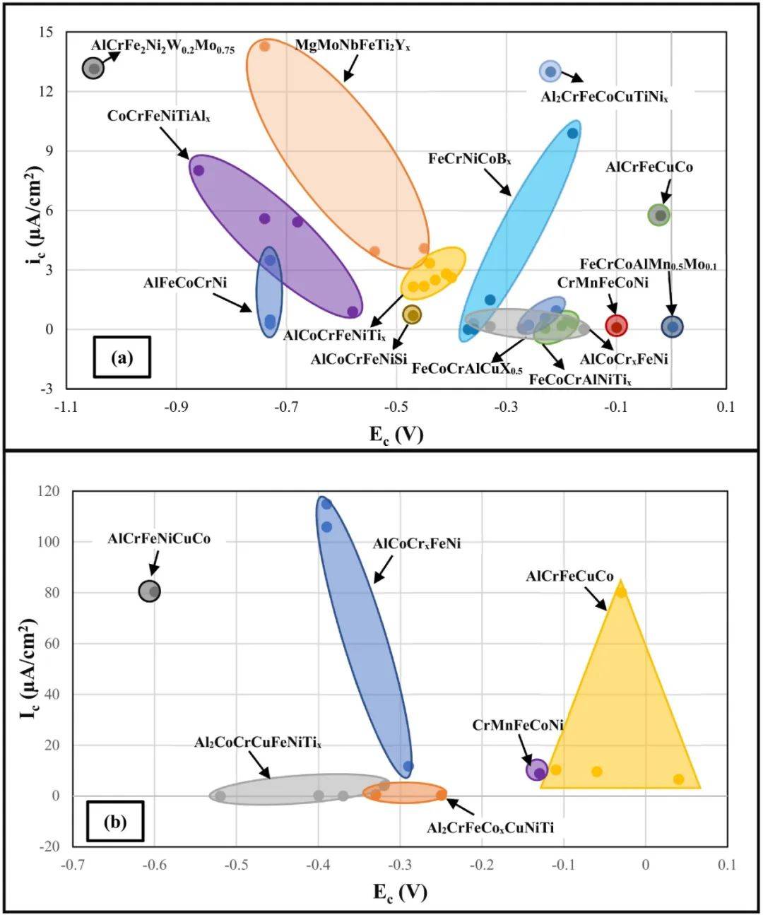 圖37 HEACs腐蝕電流密度(Ic)和腐蝕電位(Ec)的比較(a)在含氯溶液中,由于Cr元素的鈍化膜,AlCoCrxFeNi表現(xiàn)出更好的腐蝕行為;(b)在酸性溶液中,由于Co(OH)2鈍化氧化膜的存在,Al2CrFeCoxCuNiTi具有更好的耐蝕性。