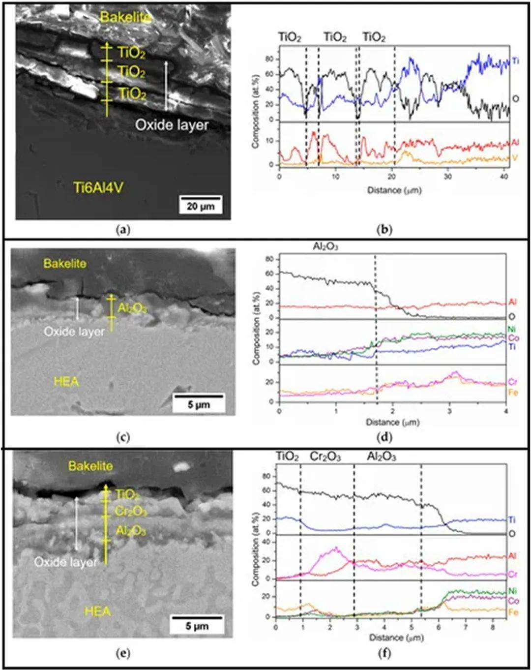 圖39 試樣熱處理45小時(shí)后,沿界面進(jìn)行了BSE截面圖像及相應(yīng)的EDS分析,以研究其氧化行為;(a) 700°C的鈦基體僅含有TiO2層,且TiO2層易碎,氧化后會(huì)脫落;(b) 700°CAlCrCoFeNiTi0.5, Al2O3層;(c) 800°c的AlCrCoFeNiTi0.5由TiO2,Al2O3和Cr2O3組成,其中內(nèi)層(Al2O3)和中間層(Cr2O3)保護(hù)包層不受氧氣擴(kuò)散的影響。