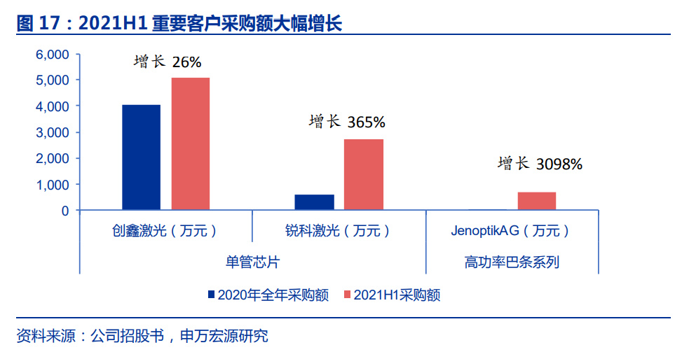 其中,創(chuàng)鑫激光 2021H1 向公司采購了5,083.75 萬元單管芯片,較2020 年全年采購金額4,030.97 萬元增長了26.12%;銳科激光 2021H1 向公司采購了 2,742.78 萬元單管芯片,較 2020 年全年采購金額 589.75 萬元增長了 365.08%。