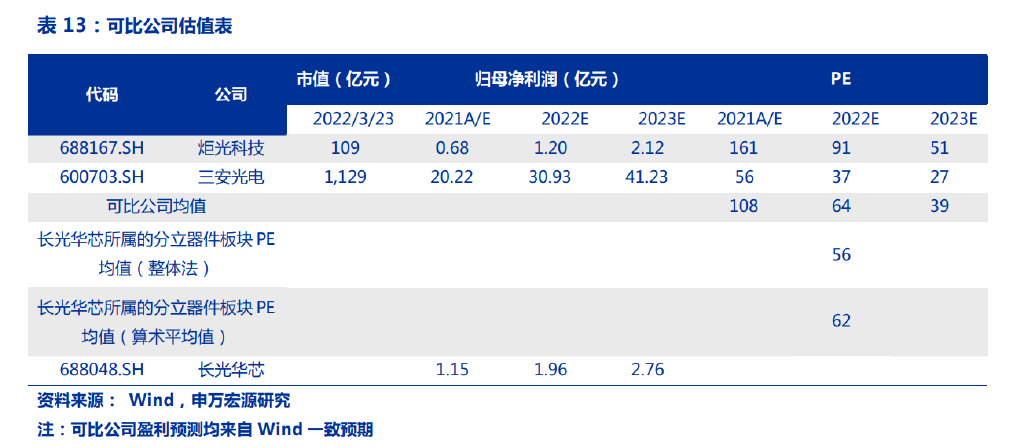 我們進一步將此結(jié)果與長光華芯所在的申萬行業(yè)分類中分立器件板塊的 22 年平均 PE 進行比較,后者使用整體法和算術(shù)平均法得出的 PE 均值分別為 56X、62X。