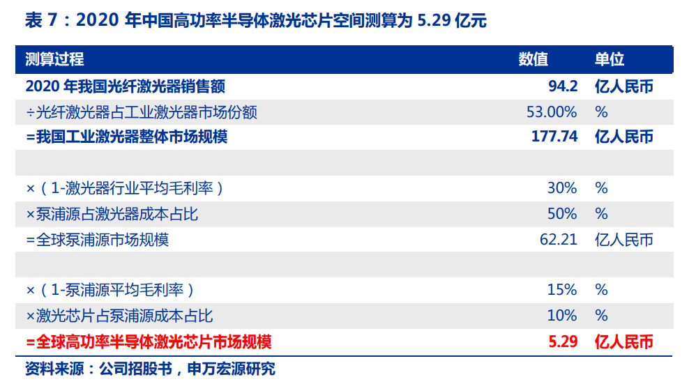 6)激光芯片占泵浦源成本占比:按照 10%測算根據(jù)公司招股書測算,2020 年我國高功率半導體激光芯片市場規(guī)模約為 5.29 億元人 民幣。根據(jù)《2021 年中國激光產(chǎn)業(yè)發(fā)展報告》,2020 年我國光纖激光器市場規(guī)模為 94.20 億元。