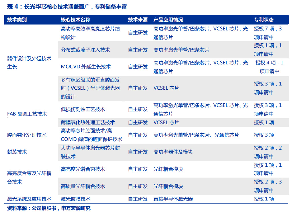 1)針對半導體激光行業(yè)核心的芯片環(huán)節(jié):公司已建成覆蓋芯片設計、外延生長、晶圓處理工藝(光刻)、解理/鍍膜、封裝測試、光纖耦合等 IDM 全流程工藝平臺。已建成 3 吋、6 吋量產(chǎn)線,應用于多款半導體激光芯片開發(fā)。公司已突破一系列關鍵技術(shù),是少數(shù)研發(fā)和量產(chǎn)高功率半導體激光芯片的公司之一。