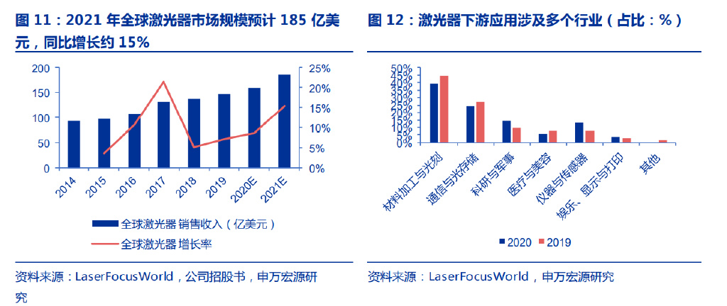 2021 年全球激光器市場規(guī)模預計約 185 億美元,同比增長 15% 。