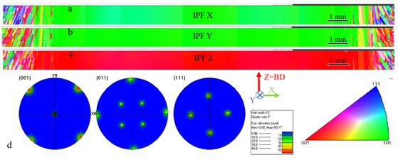為確認EBSM制備IN738合金單晶結構,在圖1f的兩個標識區(qū)域進行了EBSD觀察。區(qū)域1中的單晶組織如圖2所示。圖2a-c清析地顯示了單晶的存在。圖2d中顯示的球坐標投影進一步證實了單晶的存在。區(qū)域1的單晶寬度大于14 mm。
