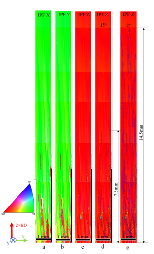 為了解晶粒選擇的過程和機制,在多晶區(qū)和單晶區(qū)之間的過渡區(qū)2進行了EBSD測量,結果如圖3所示。從圖3a-c可以看出,在試樣下部,柱狀晶粒較多,織構較強,而上部僅存在單一晶粒。在由下部諸多柱狀晶粒向上部單晶過渡的過程中,存在晶粒取向的選擇。晶粒選擇的過程可以分為幾個階段。首先,在最初的幾層中,多晶不銹鋼底板上各種取向的晶粒廣泛共存,外延生長的晶粒取向差較大;在沿成形方向的溫度梯度作用下,柱狀晶沿FCC金屬優(yōu)勢生長方向[001]定向生長;進一步,這些柱狀晶開始在成形過程中競爭生長,隨著成形高度進一步增加,越來越多與溫度方向不接近的晶粒因失去生長空間而被取代,直到最終單一晶粒被選擇出來。從7.5 mm高度開始,取向偏差大于15度的晶粒被優(yōu)勢晶粒取代(圖3d),進一步,取向偏差大于2度的晶粒在14.5 mm高度處被優(yōu)勢晶粒取代(圖3e)。最后,[001]方向晶粒取代所有其他晶粒方向,在上部出現單晶。這一選晶過程是一個動態(tài)的過程,存在于成形全過程,而鑄造螺旋選晶只在最初有選晶過程,之后不再對晶粒選擇。