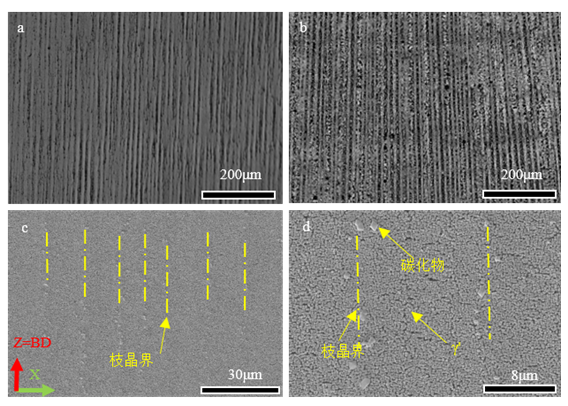 鑄造單晶的枝晶寬度通常約為200-400 μm。EBSM制備IN738合金單晶的枝晶組織表征如圖4所示。從圖4a-b可以看出,通過實驗測量,一次枝晶臂間距(PDAS)為15 μm左右。高倍率下的顯微結構圖像如圖4c-d所示,從圖中可以清楚地觀察到析出相γ'和沿枝晶邊界析出的碳化物。γ'相析出比例較高,碳化物沿晶界排列。