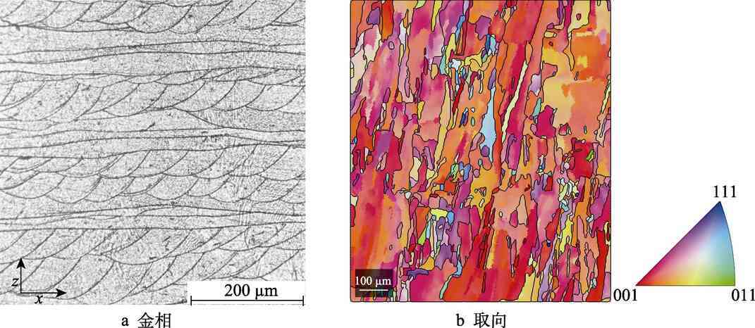 采用80#~2000#砂紙,對(duì)試樣的xy 面和xz 面分別進(jìn)行機(jī)械研磨,隨后采用3 μm的金剛石懸浮液進(jìn)行拋光,接著采用美國(guó)VibroMet 2振動(dòng)拋光機(jī)進(jìn)行振動(dòng)拋光,最后采用光學(xué)顯微鏡(Optical microscopy,OM)和電子背散射衍射(Electron backscatter diffraction,EBSD)進(jìn)行觀察。對(duì)于 OM試樣,采用 100 mL HCL+100 mL CH3CH2OH+5 g CuCl2 溶液進(jìn)行化學(xué)腐蝕。采用OLYMPUS-GX71型光學(xué)顯微鏡和Philips XL30FEG型掃描電子顯微鏡進(jìn)行微觀組織觀察,采用Mitutoyo HM-102型硬度儀進(jìn)行了硬度測(cè)量,最后根據(jù)阿基米德原理,測(cè)量了試樣的密度。