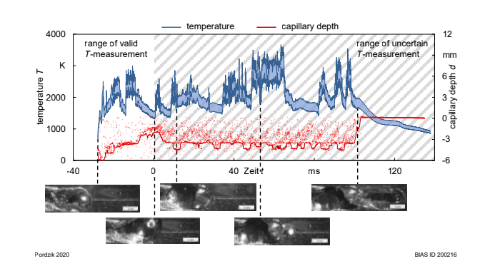 該系統(tǒng)的動(dòng)力學(xué)特征是在很短的時(shí)間尺度上出現(xiàn)波動(dòng),需要使用高速測(cè)量來充分映射過程的基本特征。由于涉及各種物理現(xiàn)象,并且不同材料相之間存在界面,因此只能通過結(jié)合多種測(cè)量方法來全面研究該過程。毛細(xì)管壁處的溫度分布被認(rèn)為是過程行為的中心參數(shù),可以通過本文介紹的新型測(cè)試裝置和樣品設(shè)計(jì)進(jìn)行高溫分析。通過光學(xué)相干層析成像(OCT)對(duì)蒸汽毛細(xì)管進(jìn)行高速圖像和深度測(cè)量,補(bǔ)充了這些測(cè)量。這使得測(cè)定的壁溫時(shí)間過程與毛細(xì)管深度的變化、毛細(xì)管開口的變化和過程現(xiàn)象(如井噴或飛濺)相關(guān)。