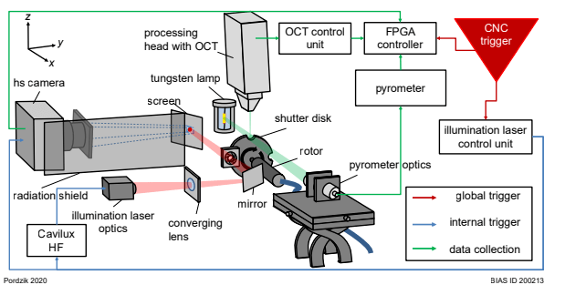 帶有半圓形缺口的旋轉(zhuǎn)圓盤同時(shí)打開高溫計(jì)和照明激光器的光束路徑。對(duì)于高溫計(jì)而言,可測(cè)量的信號(hào)由鎢燈的熱輻射組成,而高速攝像機(jī)檢測(cè)照明激光光斑在屏幕上的投影。OCT的測(cè)量點(diǎn)位于旋轉(zhuǎn)圓盤的邊緣??蓹z測(cè)事件是由于缺口朝邊緣打開,導(dǎo)致圓盤邊緣深度相對(duì)于探測(cè)器的變化。同步性的精度可以根據(jù)磁盤的旋轉(zhuǎn)速度而變化。在最大轉(zhuǎn)速下,對(duì)于給定尺寸的圓盤光圈,可達(dá)到δtmin=40μs的最大精度,這小于高速曝光的曝光時(shí)間。