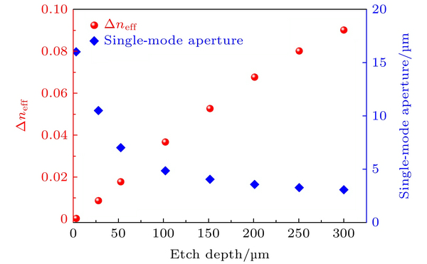 圖 4 隧穿結(jié)臺面刻蝕深度對芯層與包層的折射率差值Δneff = neff-core-neff-cladding以及單模工作區(qū)直徑的影響