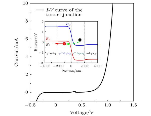 ??圖3插圖為模擬的隧穿結(jié)材料層在外加偏壓超過開啟電壓后的能帶結(jié)構(gòu)圖. 隧穿結(jié)采用n型及p型重?fù)诫s材料, 界面處重?fù)诫sn型層的導(dǎo)帶與p型層的價(jià)帶位于同一水平, 因而當(dāng)電壓繼續(xù)增加, n型層的載流子電子直接隧穿至p型層, 實(shí)現(xiàn)電流注入, 而不存在額外的勢壘. 這也是隧穿結(jié)結(jié)構(gòu)的基本工作原理.