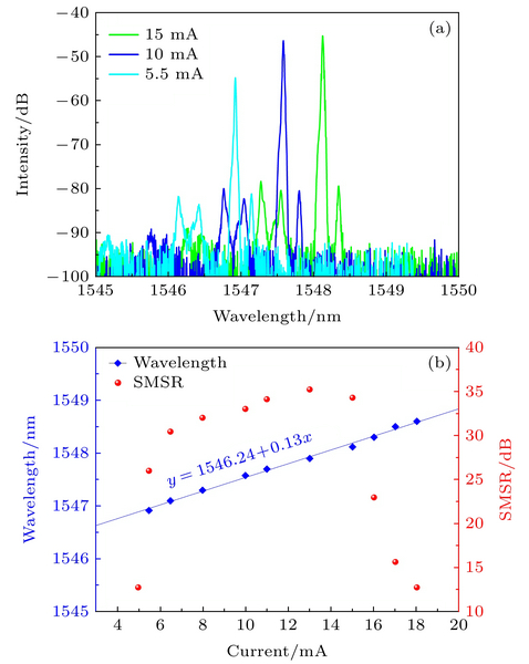 ??圖6(a)給出了工作溫度為15℃時(shí), 采用橫河6370D高精度光譜儀測得的VCSEL在5.5, 10和15 mA工作電流下的激光光譜. 可以看出, VCSEL在這3個(gè)工作電流下的激光光譜主峰模式(基模)與次級峰模式(高階模)的強(qiáng)度差呈現(xiàn)非常良好的單模輸出特性[21,22]. 當(dāng)工作電流為10 mA時(shí), VCSEL中心波長為1547.58 nm, 邊模抑制比(side mode suppression ratio, SMSR)達(dá)到了33 dB. 隨著工作電流增加, 出光波長出現(xiàn)紅移現(xiàn)象, 這是因?yàn)閂CSEL在工作電流增加時(shí)內(nèi)部熱效應(yīng)增強(qiáng)導(dǎo)致的。