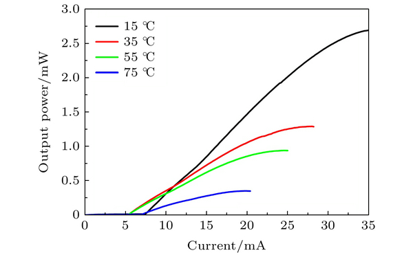 ??制備的1550 nm VCSEL芯片被封裝在TO管殼中, 其底部裝有TEC控溫及NTC測溫元件. 通過改變控溫系統(tǒng)溫度, 測量VCSEL在不同工作溫度下的功率-電流曲線, 測試結(jié)果如圖5所示. VCSEL在15 ℃下的熱飽和功率達(dá)到2.6 mW. 隨著工作溫度的增加, 最大熱飽和功率快速降低, 在35 ℃下的熱飽和功率仍然可以達(dá)到1.3 mW. VCSEL的閾值電流隨溫度的變化趨勢呈現(xiàn)出典型的增益—腔模失配型VCSEL閾值電流特性[20]. 當(dāng)工作溫度由15 ℃增加到35 ℃后, 熱飽和功率有所降低, 閾值電流也隨之減小, 由15 ℃時(shí)的7.4 mA降低到35 ℃時(shí)的5.4 mA. 閾值電流隨工作溫度增加而減小, 是因?yàn)樵O(shè)計(jì)的增益峰值波長與激光器出光波長相對藍(lán)移, 隨著工作溫度的增加, 由于增益峰值波長漂移速率比激光器出光波長漂移速率快近一個(gè)數(shù)量級, 因而在較高溫度下實(shí)現(xiàn)了增益與激光器工作波長的較好匹配. 當(dāng)工作溫度繼續(xù)增加至55 ℃時(shí), 激光器的增益與工作波長匹配度仍然較好, 因而VCSEL閾值電流與35 ℃相比并無明顯變化. 隨著工作溫度繼續(xù)增加至75 ℃, 增益與工作波長出現(xiàn)失配, 閾值電流繼續(xù)增加. 雖然當(dāng)工作溫度在75 ℃時(shí)VCSEL功率急劇下降, 然而其熱飽和出光功率仍然可以達(dá)到0.35 mW.