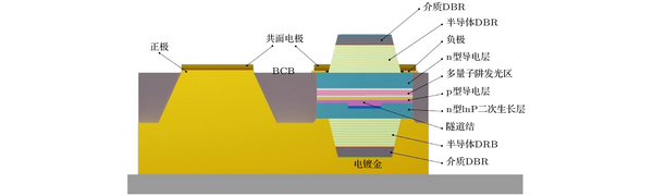 ??VCSEL的制備工藝流程如下: 采用金屬有機(jī)化學(xué)氣相沉積外延設(shè)備在InP襯底依次生長上半導(dǎo)體DBR、N型導(dǎo)電層、發(fā)光層及隧穿結(jié)結(jié)構(gòu)后, 利用干法刻蝕設(shè)備刻蝕出隧穿結(jié)臺面, 然后再次生長導(dǎo)電層及下DBR中的半導(dǎo)體DBR. 之后通過電子束蒸鍍設(shè)備蒸鍍下半導(dǎo)體DBR外部的CaF2/Si介質(zhì)膜DBR. 制備完成后, 采用電子束蒸金及鍍金設(shè)備完成金屬電極制備, 并采用鍵合設(shè)備將整個(gè)結(jié)構(gòu)鍵合到帶有金屬化圖形的透明金剛石薄片上, 以支撐上DBR制備工藝?yán)^續(xù)進(jìn)行. 將InP襯底采用選擇性腐蝕工藝去除后, 繼續(xù)刻蝕出臺面結(jié)構(gòu), 填充BCB材料并利用電子束蒸鍍設(shè)備形成金屬電極. 最后在上DBR上蒸鍍介質(zhì)膜, 完成工藝制備. 為了獲取良好的散熱效果, VCSEL的底部電極在工藝過程中被加厚至20 μm以上. 激光器臺面邊緣填充BCB材料的主要目的是實(shí)現(xiàn)良好的器件支撐, 確保芯片在操作過程中不易產(chǎn)生破損.