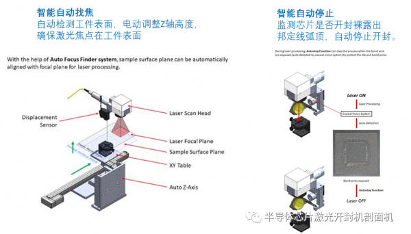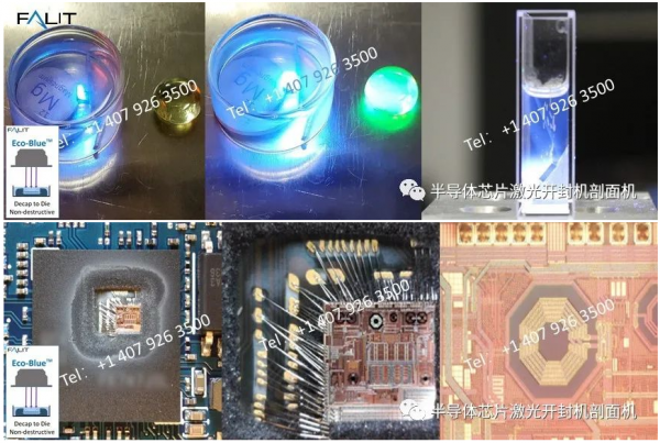 激光開封是利用激光聚焦能量,汽化EMC(epoxy mould compound)塑封層的工藝??商娲鷤鹘y(tǒng)的微型CNC機(jī)械磨除方法,結(jié)合ECO-BLUE工藝,可替代開封的后續(xù)滴酸工藝。