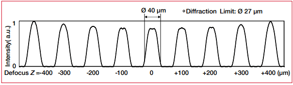 長(zhǎng)焦深光束整形器是一種衍射光學(xué)器件,其工作方式與幾何光束重映射光學(xué)器件不同。它將輸入光束分為+1階(略微收斂)和-1階(略微雙聚)光束。兩個(gè)相反或相反的光束仍在同一光軸上,由f-θ透鏡會(huì)聚并疊加在焦點(diǎn)上。由于兩個(gè)相干光束之間的光干涉,在那里出現(xiàn)了平頂光強(qiáng)分布。光斑形狀原則上是圓形或方形(圖7e–g),但當(dāng)增加入射光束尺寸時(shí),平頂光束會(huì)變?yōu)榄h(huán)形光束(圖7h)。雖然邊緣輪廓的輪廓不像光束重映射得到的輪廓那么銳利,但可以實(shí)現(xiàn)更小的光斑尺寸和更長(zhǎng)的聚焦深度。